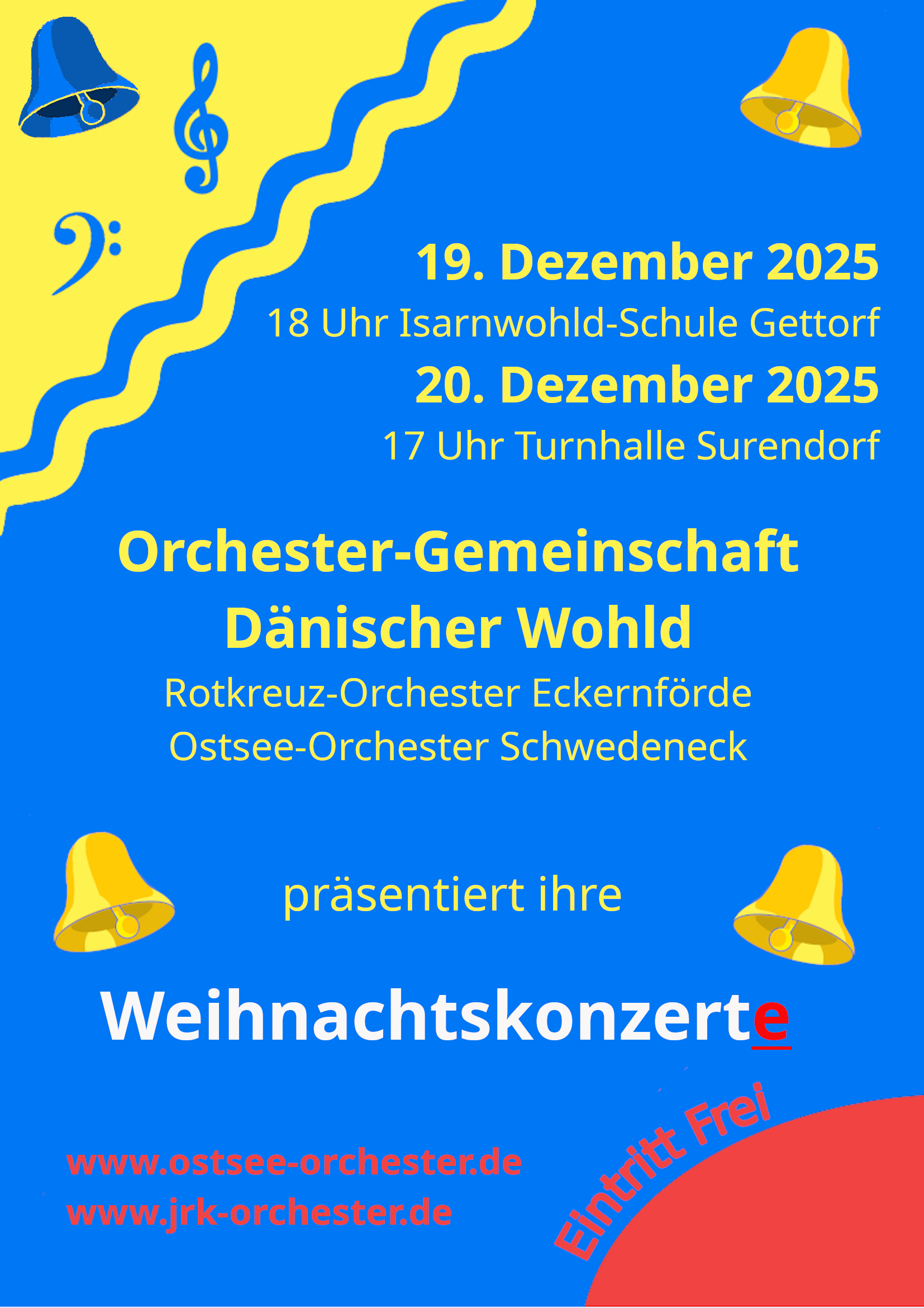 Das JRK-Orchester Eckernförde und das Ostsee-Orchester Schwedeneck sind eine Kooperation eingegangen und präsentieren sich nun gemeinsam. Nach dem Eröffnungs-Konzert im April in der Kirche in Gettorf folgen nun weitere Weihnachtsauftritte mit dem Abschluss der beiden Weihnachtskonzerte in Gettorf und in Surendorf !